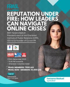 The Public Relations Association of Sri Lanka in collaboration with The Sun (Daily Mirror), Wijeya Newspapers Limited, will host an exclusive learning and networking event titled “Reputation Under Fire: How Leaders Can Navigate Online Crises” on 16 December 2025 at the Sheraton Colombo Hotel.